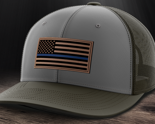 Thin Blue Line Police Flag Hat, Leather Patch Trucker Hat