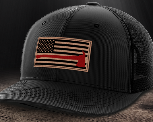 Thin Red Line Firemen Flag Hat with Axe, Leather Patch Trucker Hat